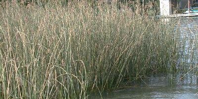 There are several species of bulrush. They can grow up to 10 feet tall in shallow water or moist soil. The color can vary from light gray-green to dark olive green. There are no obvious leaves on the stems. They grow sheaths at the base of the stem.