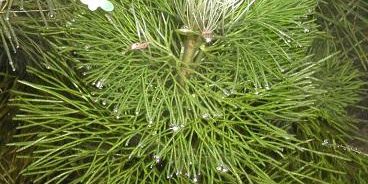 Leaves are underwater, approximately 2 inches across and divided into fine branches. Flowering branches grow above the water surface with diamond shaped leaves. Flowers are small and range from white to pale yellow. The stem is usually less than 10 feet, but can reach 33 feet.