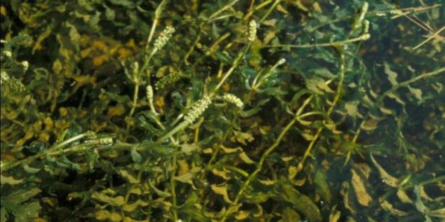 The leaves partially surround the stem, they are densely spaced, lance shaped and have wavy or crinkled margins that often curve backwards. They have distinct veins and can be 2-13 cm long and 1-3 cm wide. Often mistaken for curly-leaf pondweed.