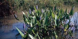 The leaves are glossy and heart shaped with long, air-filled stocks and firm blades. The leaf-blades have fine parallel veins. The leaves and flowers are above the water level and can reach 3.5 feet in height. The flower is a violet-blue color and lasts only a day.